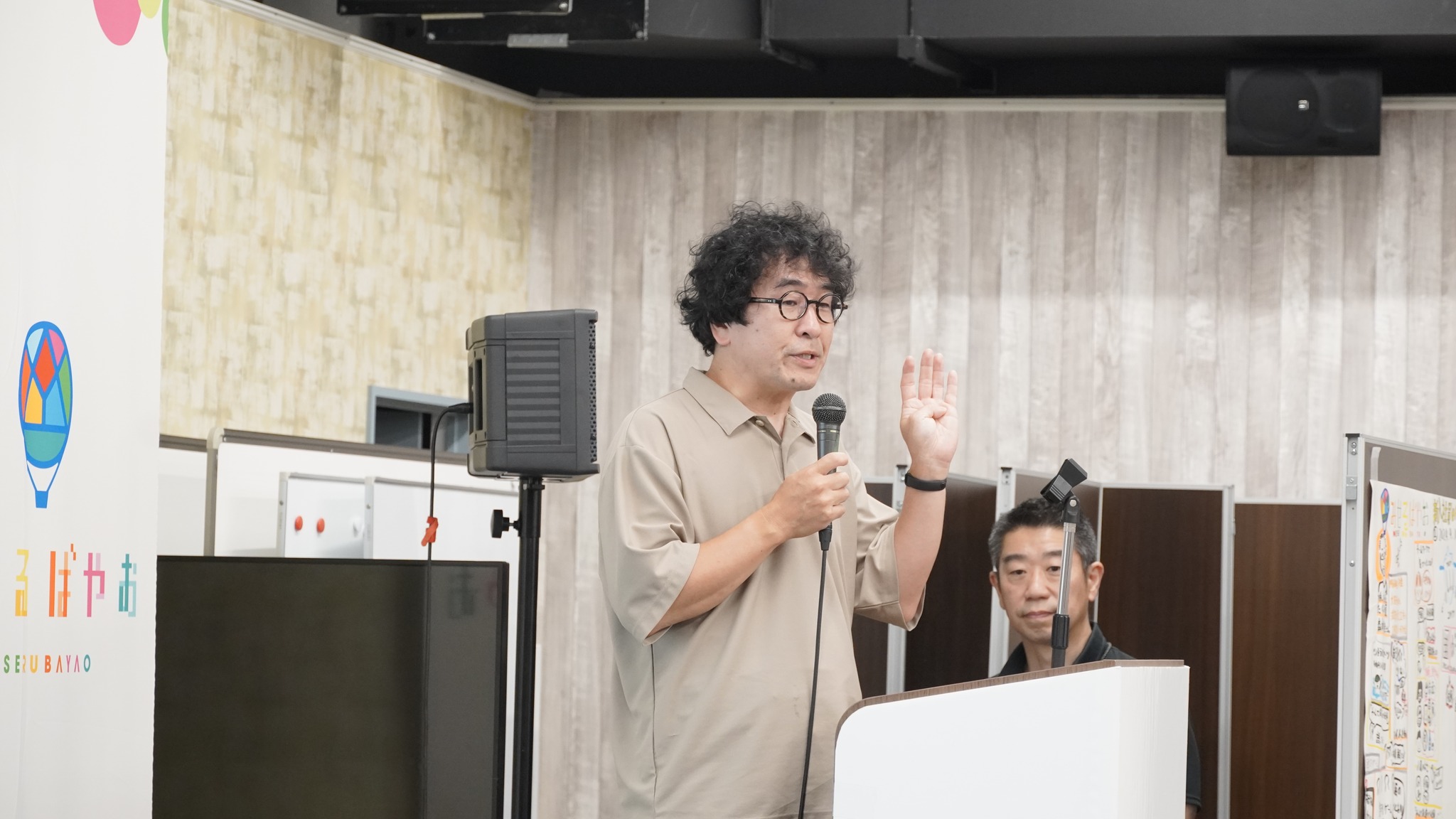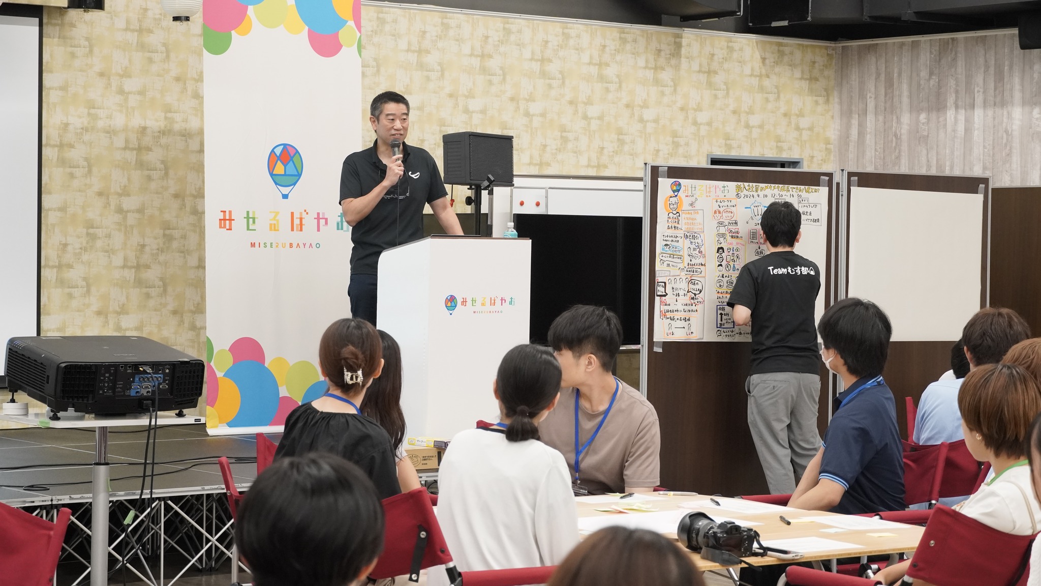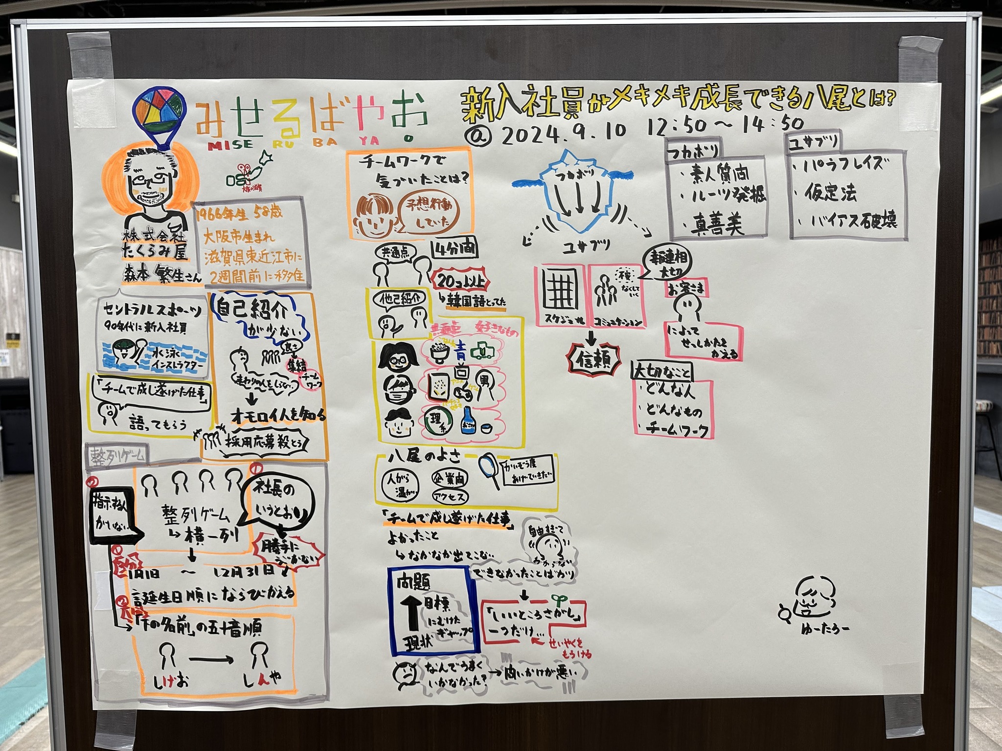 みんなで昼ごはんたべて、わいわいがやがや楽しみながら昼食後は「みせるばやおの地域の同期会でなにができるか?」をワーク形式で考えるというメニューです。今日のグラフィッカーはゆうたろうさんです。ワーク多めなので難しい現場でしたが見事描ききっていただきました!